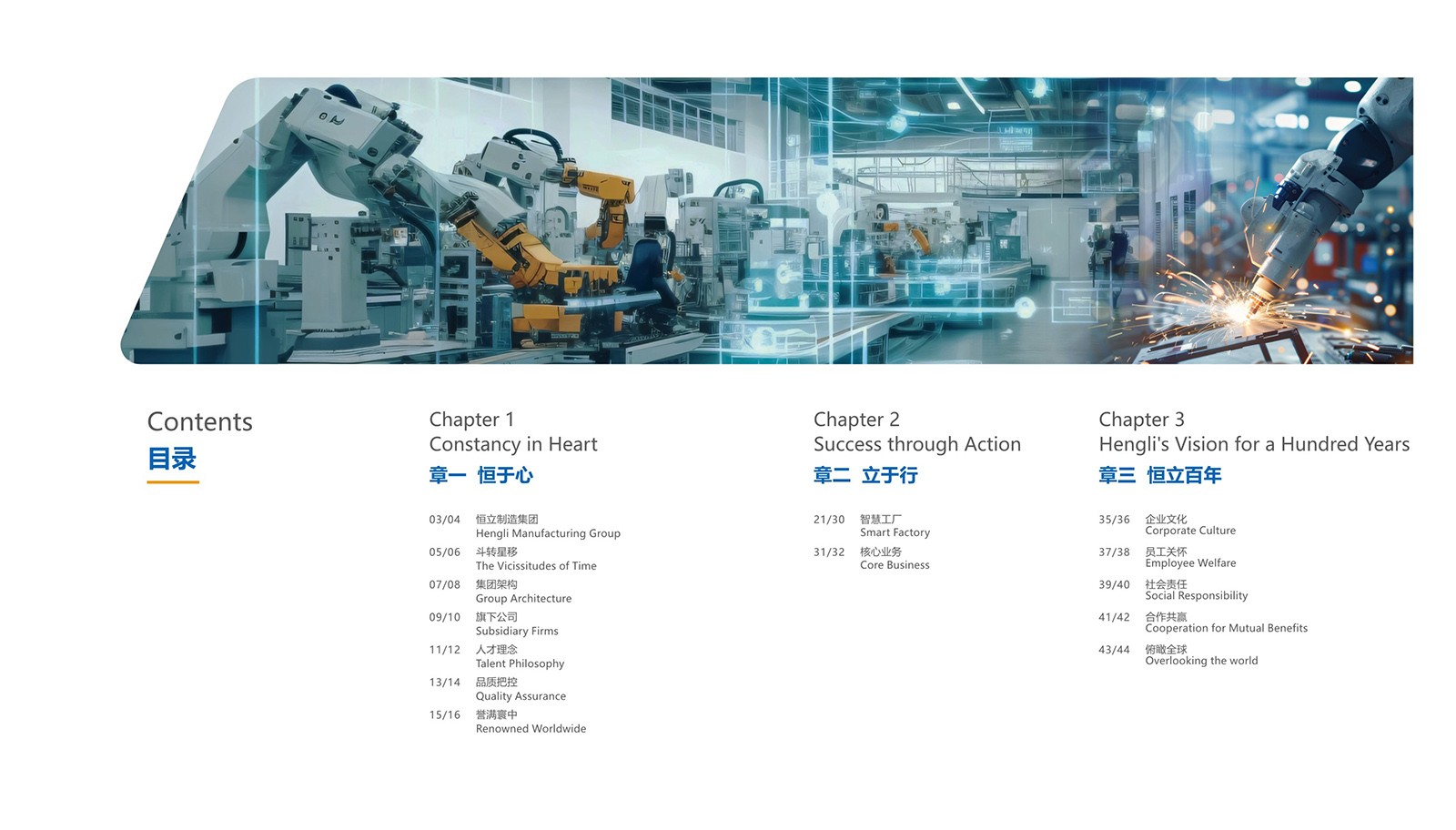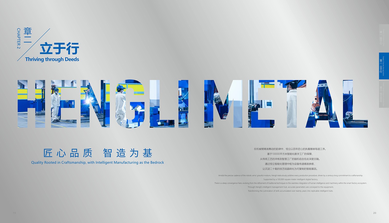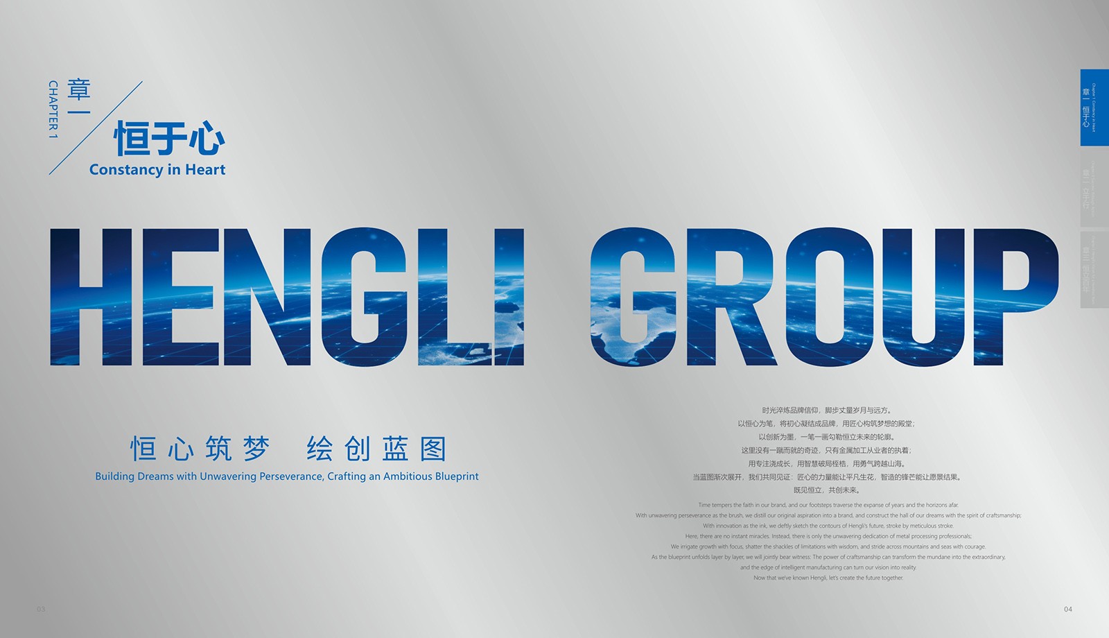 依據(jù)恒立的品牌色“恒立藍(lán)”為主色,加入印金和銀來(lái)體現(xiàn)金屬制造行業(yè)特色,采用科技感十足的設(shè)計(jì),以科技藍(lán)與未來(lái)銀為主色調(diào),搭配簡(jiǎn)潔大氣的排版風(fēng)格,使畫(huà)冊(cè)契合行業(yè)特點(diǎn)。